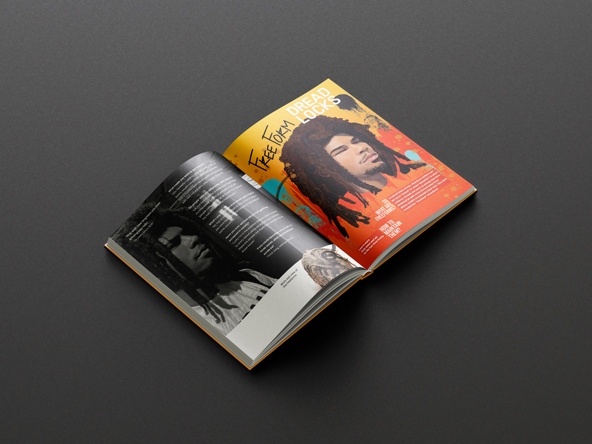 Each story is paired with an illustrative portrait that visually interprets the subject’s relationship with their hair, translating emotion and meaning into form. Balancing informative content with personal storytelling, Rooted merges factual insight with narrative depth to create a multidimensional exploration of locs.